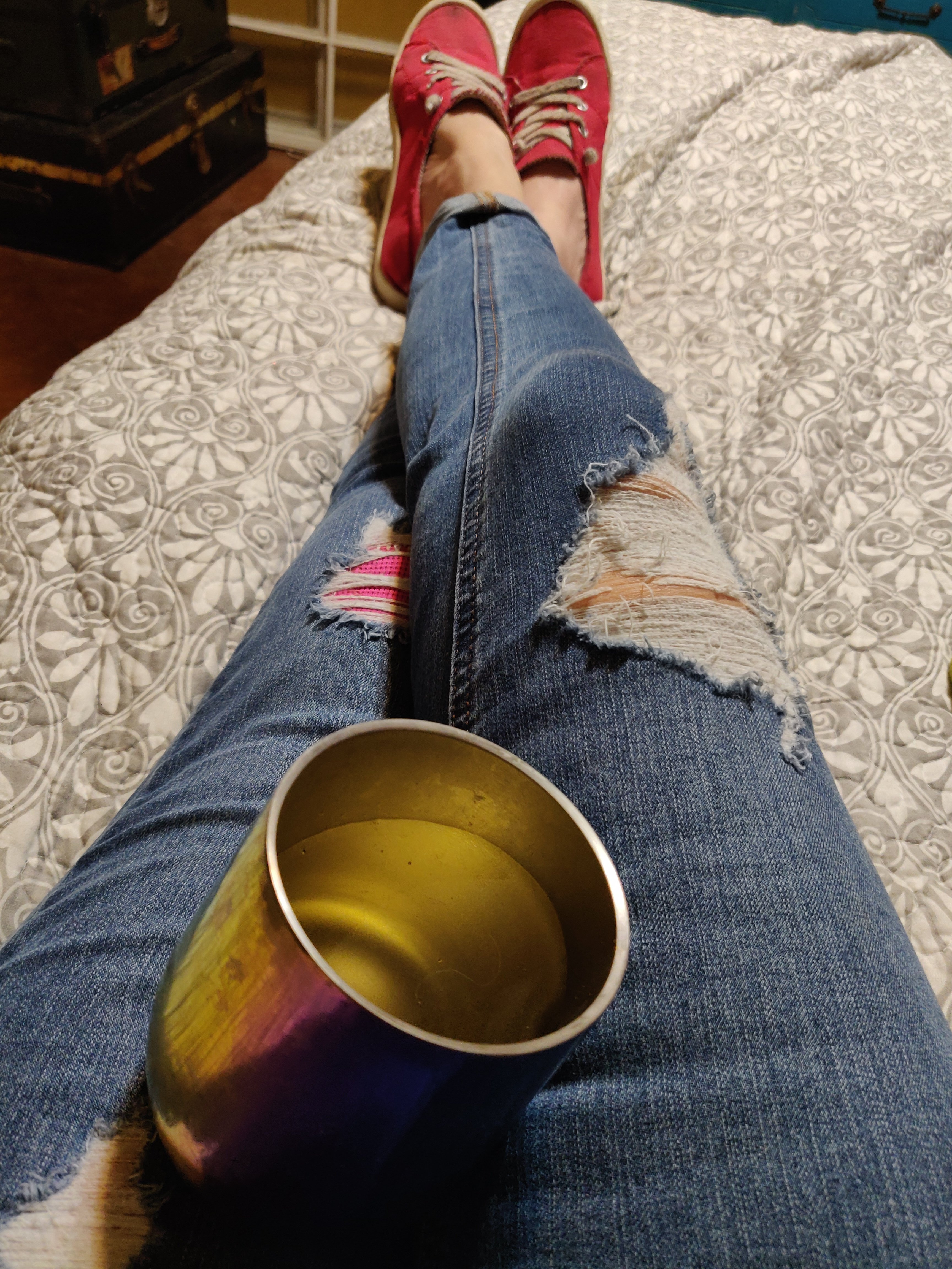 Wearing red shoes.